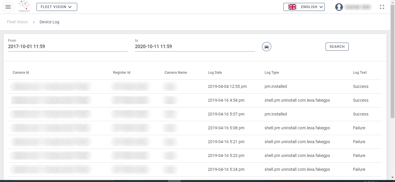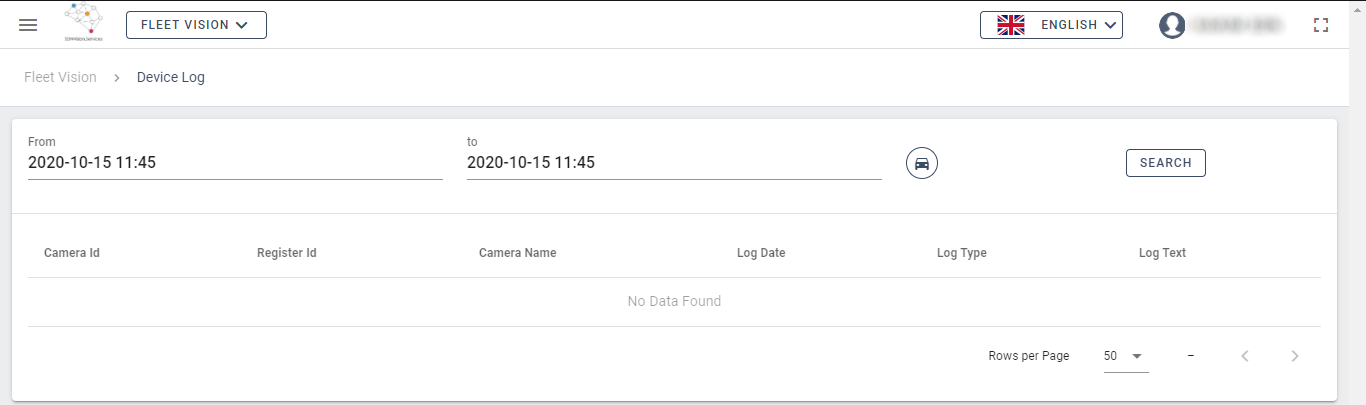 To browse the device log, click on the date under "From" to set the start date and time, and on "To" to set the end date and time. Then, click on the car shaped button to filter the camera devices you want to show, after you're done, click on confirm then press the "Search" button, a similar window appears.